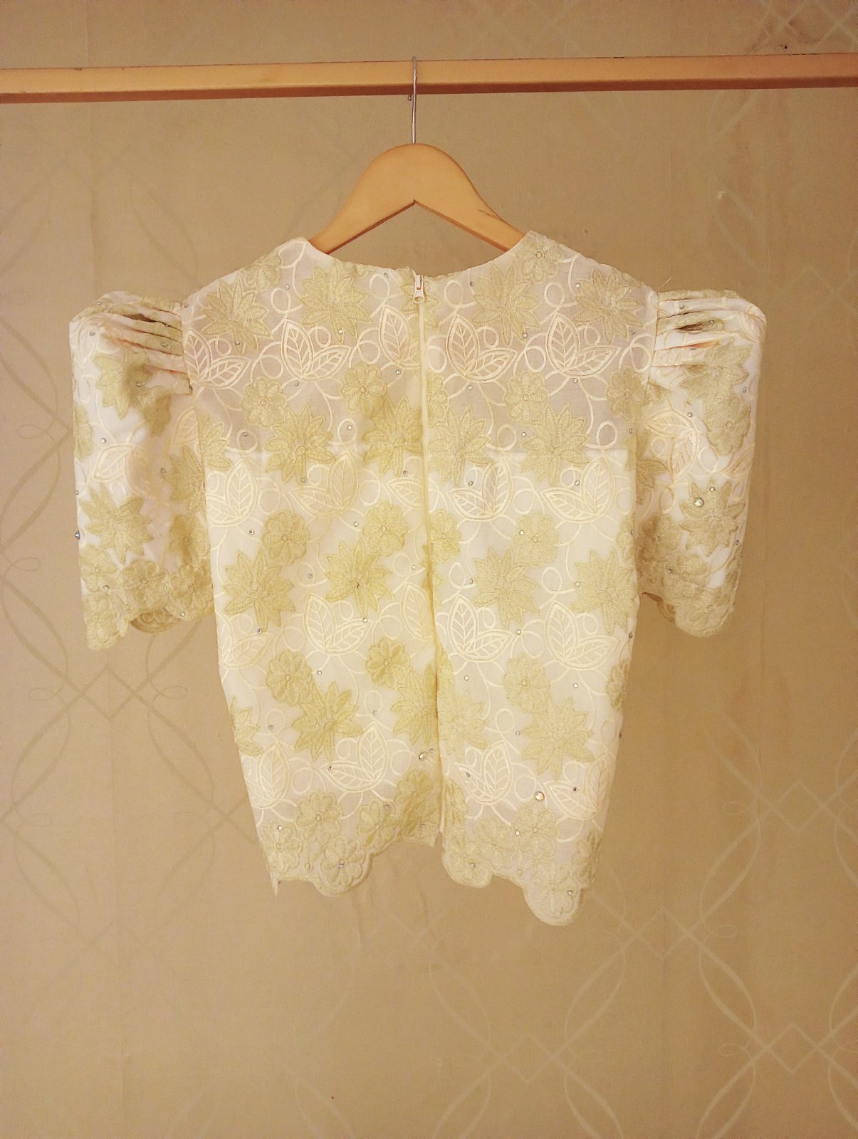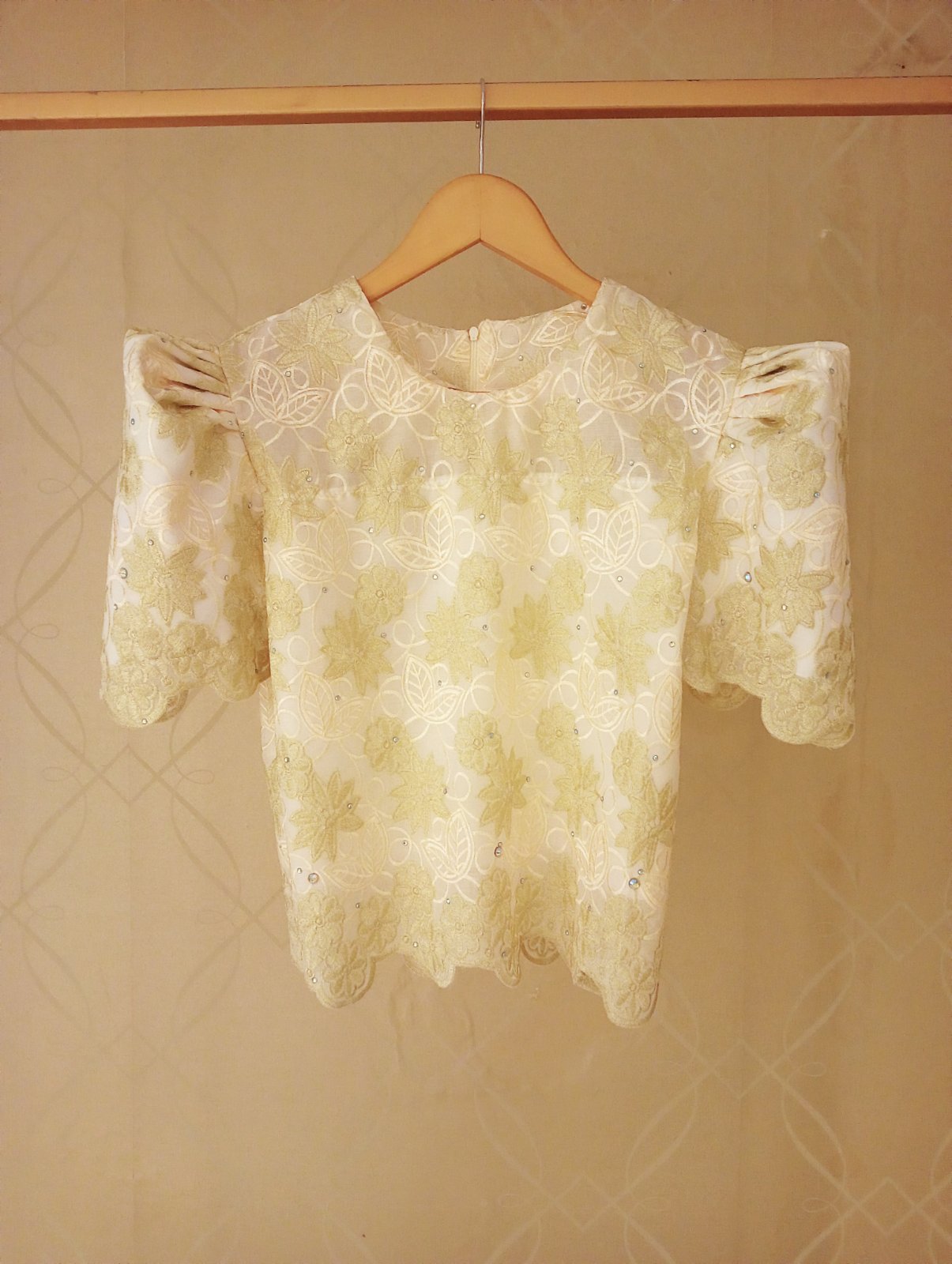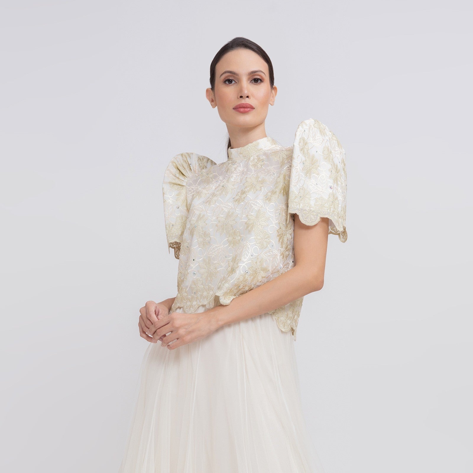 Made with lace fabric for a subtle and sophisticated sheen and have a butterfly-like sleeves. This elegant and classic Filipiñana top is a formalwear staple.